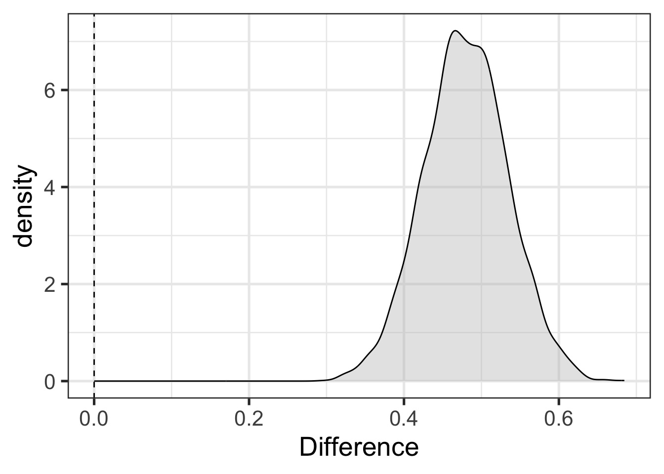 Suppose, now, that we are interested in whether Avonside and St Margaret’s alumnae have distinct productions of trap. We can get at this by sampling trap values from our model for both schools and looking at the distribution of the difference between the two.4 Figure 9.4 shows this and adds a vertical dashed line at 0. This allows a visual indication of the compatibility of the model and data with the hypothesis that the difference between schools is 0.