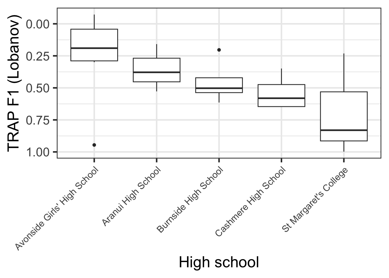 Figure 9.1 shows [trap{.smallcaps}] F1 realisations, normalised via Labanov normalisation, for all schools which have three or more students in our dataset.