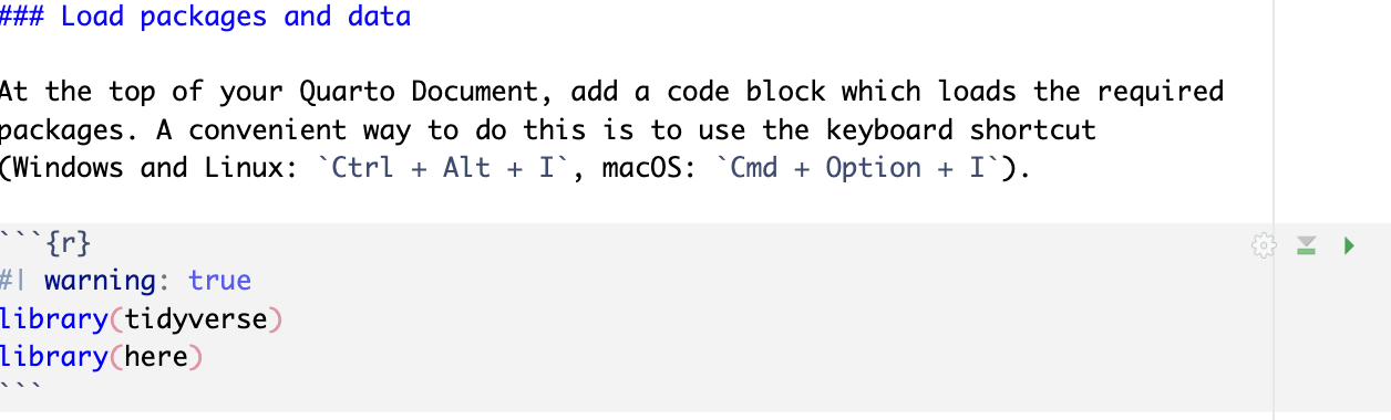 </section>Source view of a Quarto Document open in RStudio.